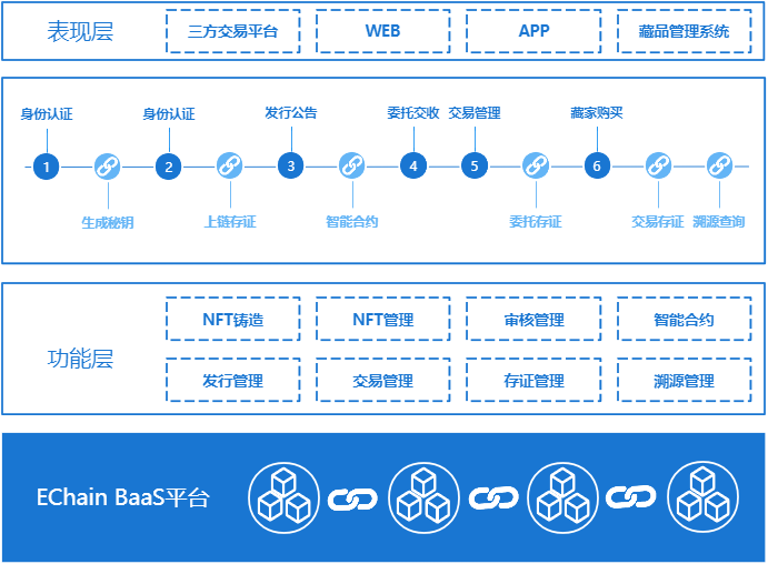 EChain數字藏品交易系統依托區塊鏈技術,實現數字藏品資產化,并且保證藏品唯一性、真實性和永久性,并有效解決了確權問題。系統實現數字藏品行業端對端覆蓋,收藏者能夠方便的進行藏品投資,創作者也能夠快速有效的完成藏品制作和發行。EChain數字藏品交易系統配備了溯源功能,數字藏品的全部交易數據完全公開透明,目的在于打造一個公平公正的收藏品交易市場。